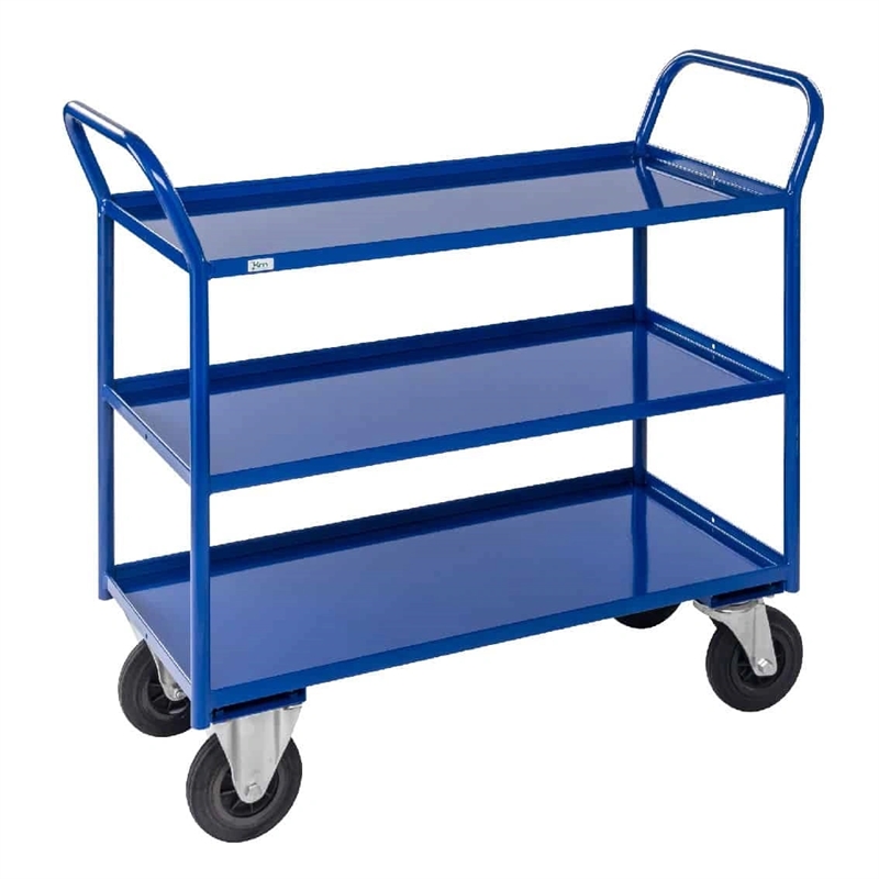 Dette er en blå rullevogn med hyldekant og bremse, 1080x450x1000 mm, med 3 hylder. Rullevognen er lavet i stål med blå pulverlakering og har 2 faste hjul og 2 drejbare hjul med bremse. Rullevognen kan klare en maks belastning på 400 kg. Rullevognen er nem at rengøre efter brug. Rullevognen har en praktisk hyldekant på 24 mm.