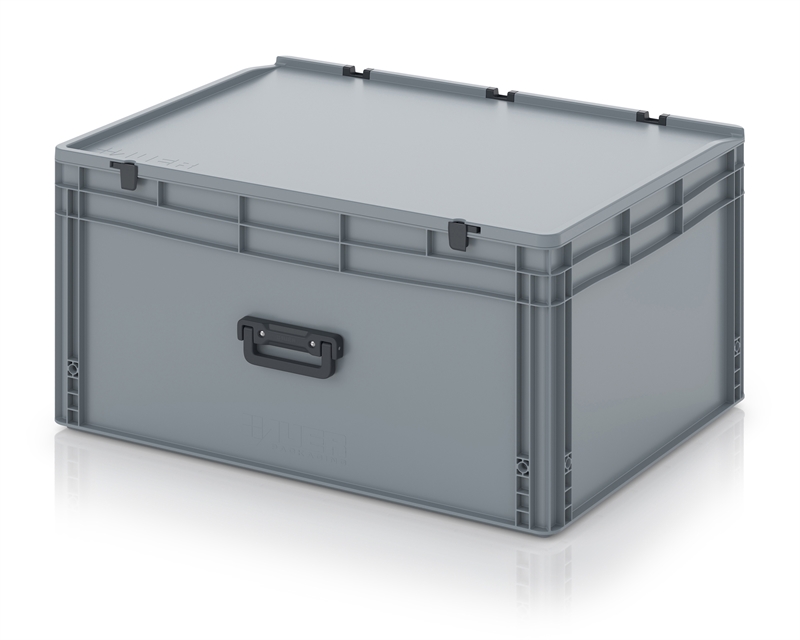 Robust og slagfast kuffertkasse i PP plast. Låget er hængslet på kassens bagkant og åbnes/låses nemt med to kliklåse. Ergonomisk håndtag er monteret på kassens front. Plastkassens bundmål er 800x600 mm og har en højde på 435 mm.